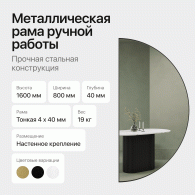 RONTUS M – это уникальное зеркало в форме полукруга с металлической рамой, которое отличается не только стильным дизайном, но и своей практичностью. Рама достаточно изящна, чтобы не перегружать композицию, но в то же время достаточно крепкая, чтобы надёжно фиксировать зеркальное полотно. Выступ рамы в 15 мм добавляет зеркалу объёмности, делая его визуально более интересным и привлекательным.