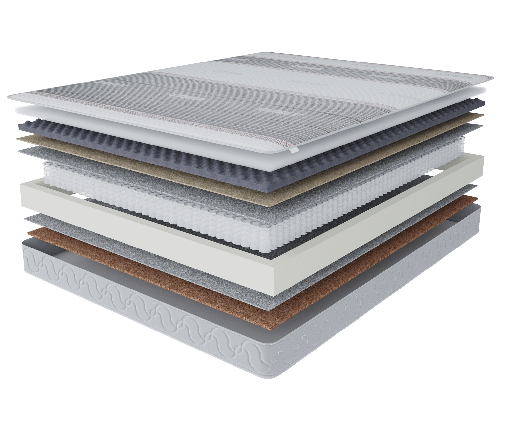 Матрас обладает разной жесткостью сторон. Вязкоаэластичная пена с эффектом микромассажа- уникальный материал, аналогичный материалам с памятью форм, но при этом создает более приятные ощущения за счет ячеек. Способствует улучшению кровообращения и предотвращает защемление мягких тканей. Один из самых востребованных материалов класса люкс. Обеспечивает циркуляцию воздуха внутри матраса, гипоаллергенен и устойчив к износу. Под ним находится слой латексированного сизаля, который отвечает за необходимую жесткость и распределение нагрузки на блок пружин, этот материал очень гибок и долговечен. Блок независимых пружин оказывает давление и поддержку только там где это необходимо, создавая при этом все условия для правильного расположения позвоночника во время сна. Обратная сторона матраса более жесткая, т.к. там используется латексированный кокосовый мат толщиной 2 см, но при этом для людей с весом ниже среднего матрас не будет казаться слишком жестким потому, что его чехол стегается на 15 мм пене с синтепоном плотностью 500 гр/м2. Обращаем ваше внимание на то, что любой матрас отвечает за правильность положения во время сна нижнего и среднего отделов позвоночника, а за правильность положения шейного отдела отвечает правильно подобранная ортопедическая подушка. Рекомендуем использование с защитным чехлом AquaStop.