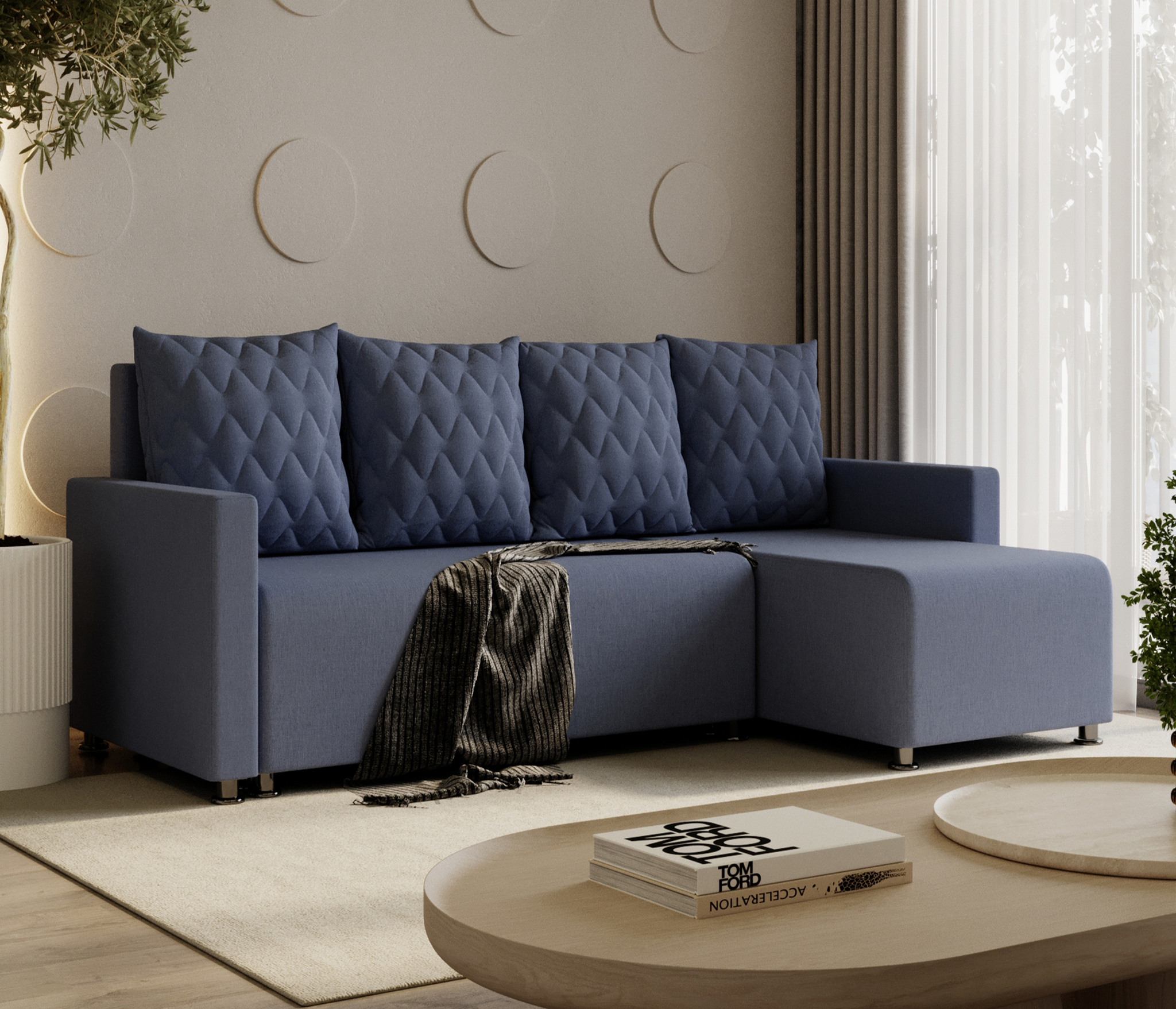 Простой и практичный угловой диван Челси с популярным механизмом трансформации «Еврокнижка», вместительным бельевым ящиком станет центральным интерьером классической гостиной, уголка отдыха в домашнем кабинете или рабочем офисе и полноценной альтернативой двуспальной кровати в гостевой комнате или однокомнатной квартире. Угловая конфигурация модели обеспечивает рациональное использование метража помещения и исключает необходимость приобретения дополнительных мест для сидения, а мягкие подспинные подушки вызывают желание присесть и расслабиться.