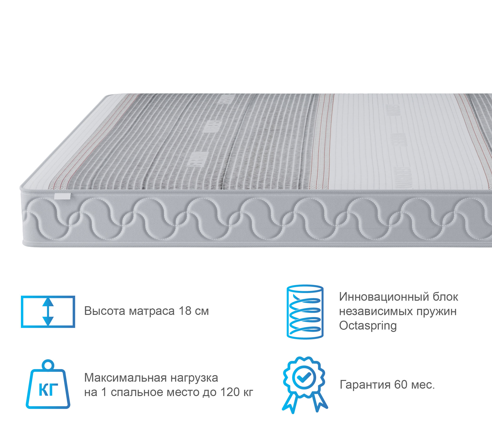 Пена Sky Cell дарит упругую поддержку и комфортную высокую жесткость. Она прекрасно распределяет нагрузку и обеспечивает качественную опору каждой части тела человека. Ребра жесткости из высокоплотной пены по всей площади матраса обеспечивают уникальную упругость, дарящую здоровый сон и заряд бодрости на весь день. Повышенная воздухопроницаемость пружин Octaspring обеспечивает комфортную свежесть спального места на протяжении всей ночи.