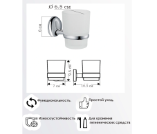 Изделие монтируется к стене при помощи надежного крепежа, выполненного из металлического сплава с хромированным покрытием. Держатель не поддается коррозии, не деформируется и не отрывается от поверхности. Матовый стакан стойкий к перепадам температуры и воздействию бытовой химии. Современный эргономичный дизайн держателя отлично сочетается с любыми аксессуарами в ванной комнате.