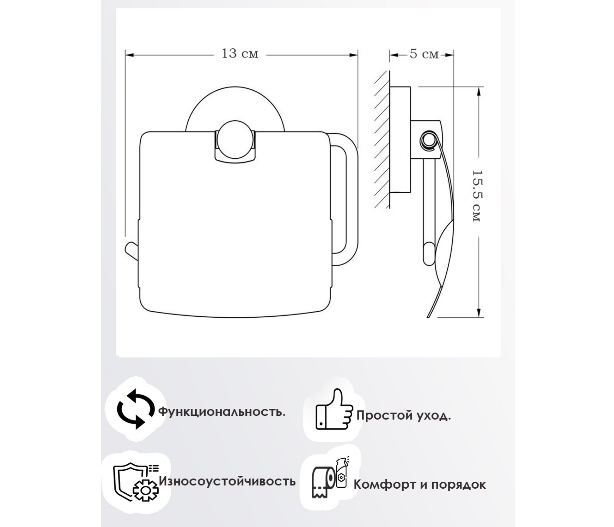 Держатель для туалетной бумаги обеспечит порядок и правильное хранение средства гигиены. Прочный материал держателя обеспечит долгий срок службы. Аксессуар для ванны выполнен в минималистичном стиле и подойдет к любому интерьеру.