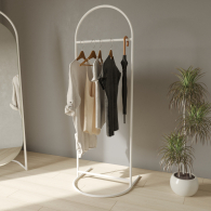 Оригинальная дизайнерская стойка для одежды ручной работы – идеальное решение для гардеробных загородных домов, прихожих квартир, примерочных бутиков одежды, специализированных отделов супермаркетов. Она выполнена в виде прочной металлической рамы, отличаются удобством и практичностью. Устойчивость этой модели рейла обеспечивает достаточно большое по площади основание, к которому жёстко прикреплена рама. При этом изделие немного весит, что позволяет с лёгкостью переставлять конструкцию с места на место.