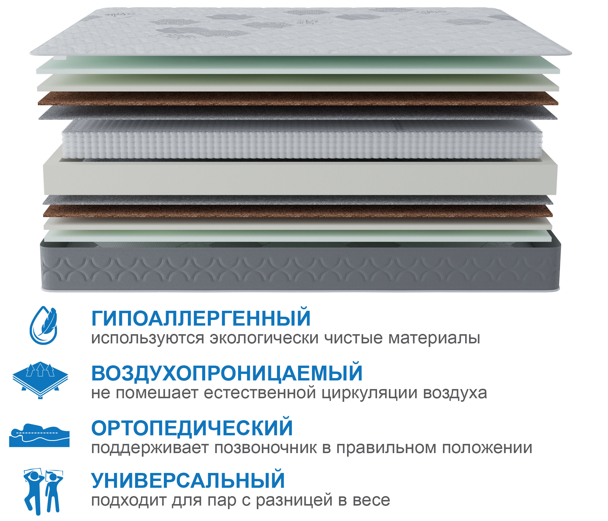 С обеих сторон матраса в качестве комфортного слоя используется 2 см искусственного латекса, этот материал очень долговечный и упругий, благодаря этому слою на этом матрасе будет одинаково комфортно людям разных весовых категорий. Для распределения нагрузки и придания необходимой жесткости используется латексированный кокосовый лист, который кладется под латекс. В основе матраса лежит блок независимых пружин, благодаря которому матрас будет индивидуально подстраиваться под каждого спящего и оказывать обратное давление только там, где это действительно необходимо. Чехол матраса сделан из плотного мягкого трикотажа, который стегается на 15 мм пене и синтепоне, что добавляет не много мягкости. Обращаем ваше внимание на то, что любой матрас отвечает за правильность положения во время сна нижнего и среднего отделов позвоночника, а за правильность положения шейного отдела отвечает правильно подобранная ортопедическая подушка. Рекомендуем использование с защитным чехлом AquaStop. |
